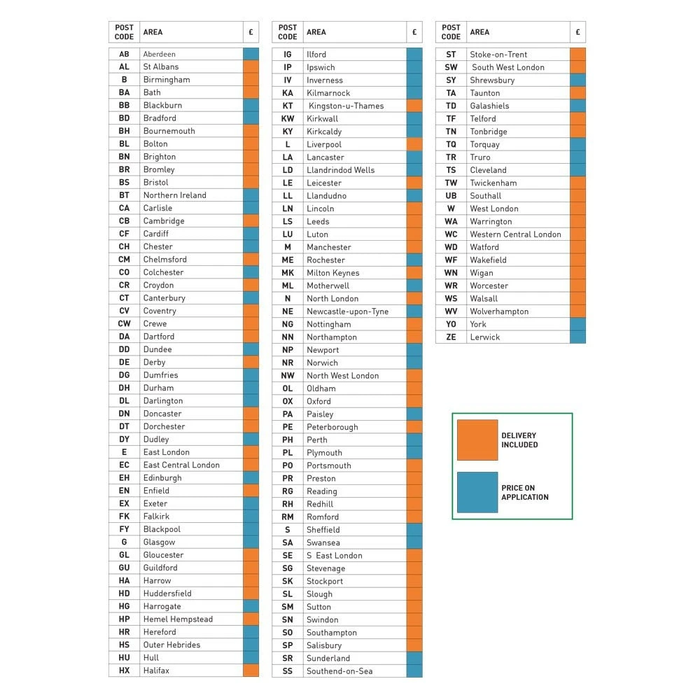 We offer free inclusive delivery for the following postcode areas: AL, B, BA, BH, BL, BN, BR, BS, CB, CM, CR, CV, CW, DA, DE, DN, DT, E, EC, EN, GL, GU, HA, HD, HP, HX, KT, L, LE, LN, LS, LU, M, MK, N, NG, NN, NW, OL, OX, PE, PO, PR, RG, RH, RM, SE, SG, SK, SL, SM, SN, SO, SP, ST, SW, TA, TF, TN, TW, UB, W, WA, WC, WD, WF, WN, WR, WS, and WV.