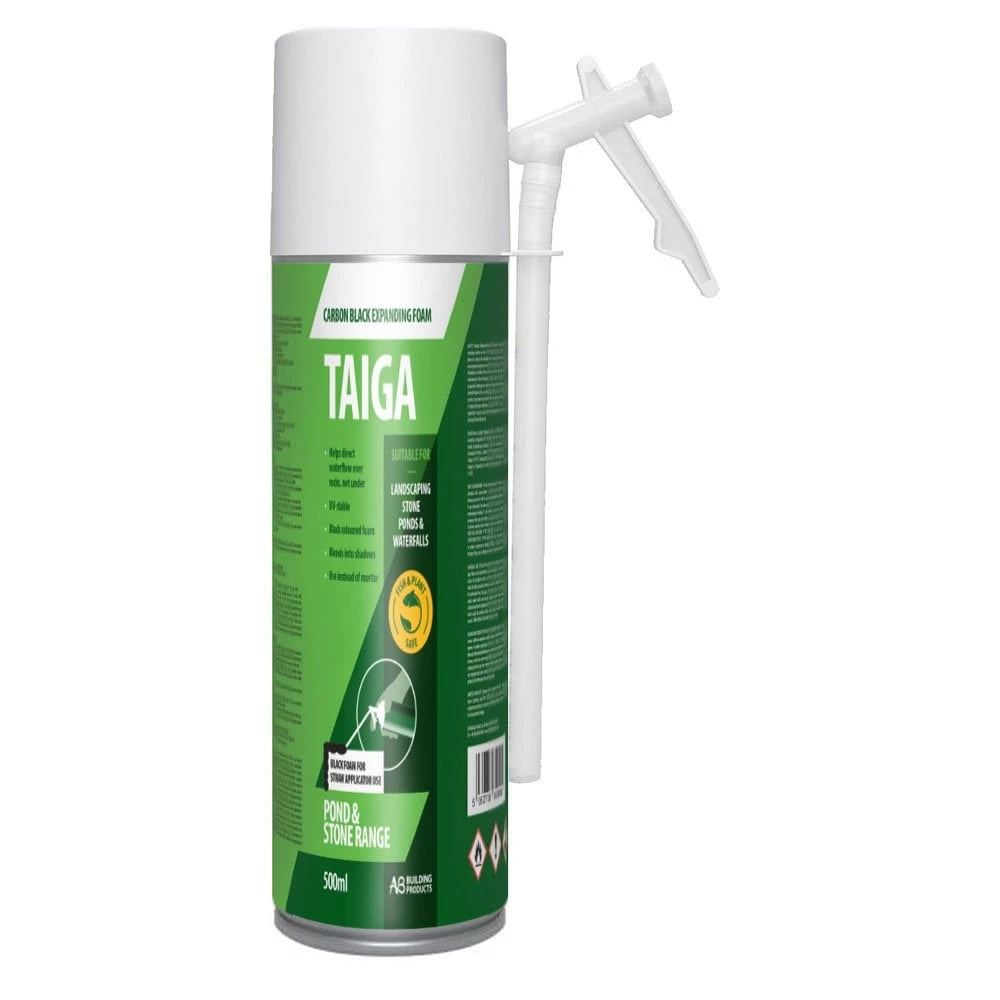 TAIGA Black Landscape Pond & Waterfall Foam is carbon black coloured foam, formulated to retain its colour and blend naturally into the surrounding landscape, even when exposed to direct sunlight. Landscape Pond & Waterfall Foam bonds quickly to porous or non-porous rock, stone, cement, wood or cloth and is suitable for both interior and exterior use.