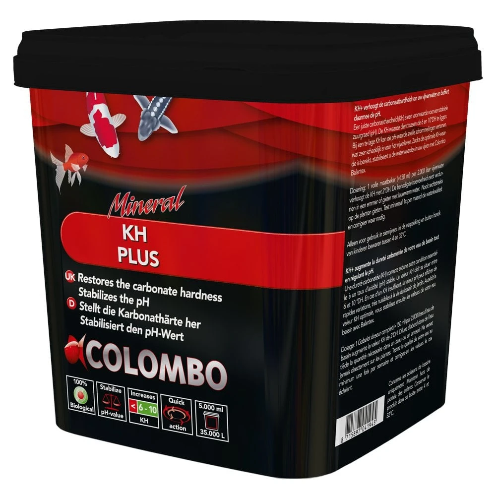 KH+ from Colombo increases the carbonate hardness of the pond water and stabilises the pH. Carbonate Hardness, also known as KH is the measurement of the total amount of dissolved carbonates within the pond water. The correct Carbonate Hardness or KH level is extremely important for the health of fish and plants as a low KH can cause the pH to fluctuate which is very harmful for aquatic life in the pond.