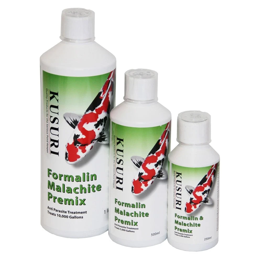 Kusuri Formalin and Malachite Premix is a ready to use full strength formulation, popular as a pond-wide anti-parasite treatment. It is particularly good for White Spot, Skin Flukes, Chilodonella, Oodinium and most Protozoan Parasites.