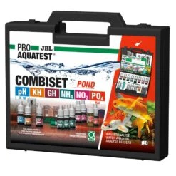 The JBL ProAquaTest CombiSet Pond Test Kit includes tests for the 6 most important water parameters: The ProAquaTest CombiSet Pond includes a pH test for the acidity, KH for the stability, GH for the mineral content, ammonium test for the fish’s health, nitrite test for toxic nitrogen and phosphate test for algae nutrient content.