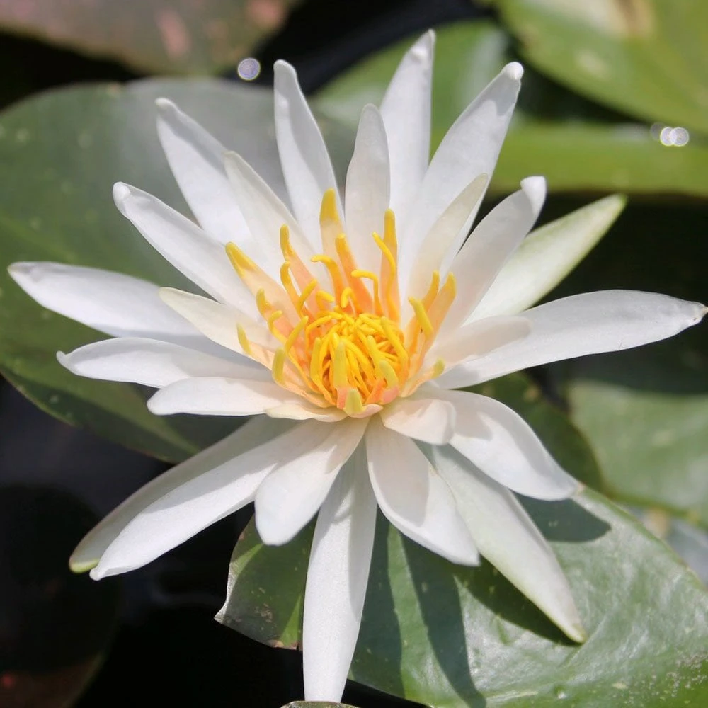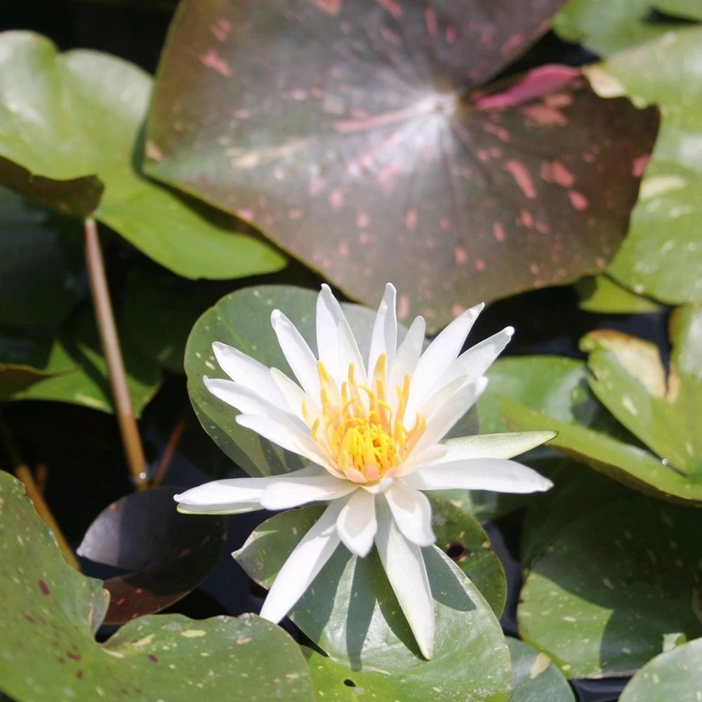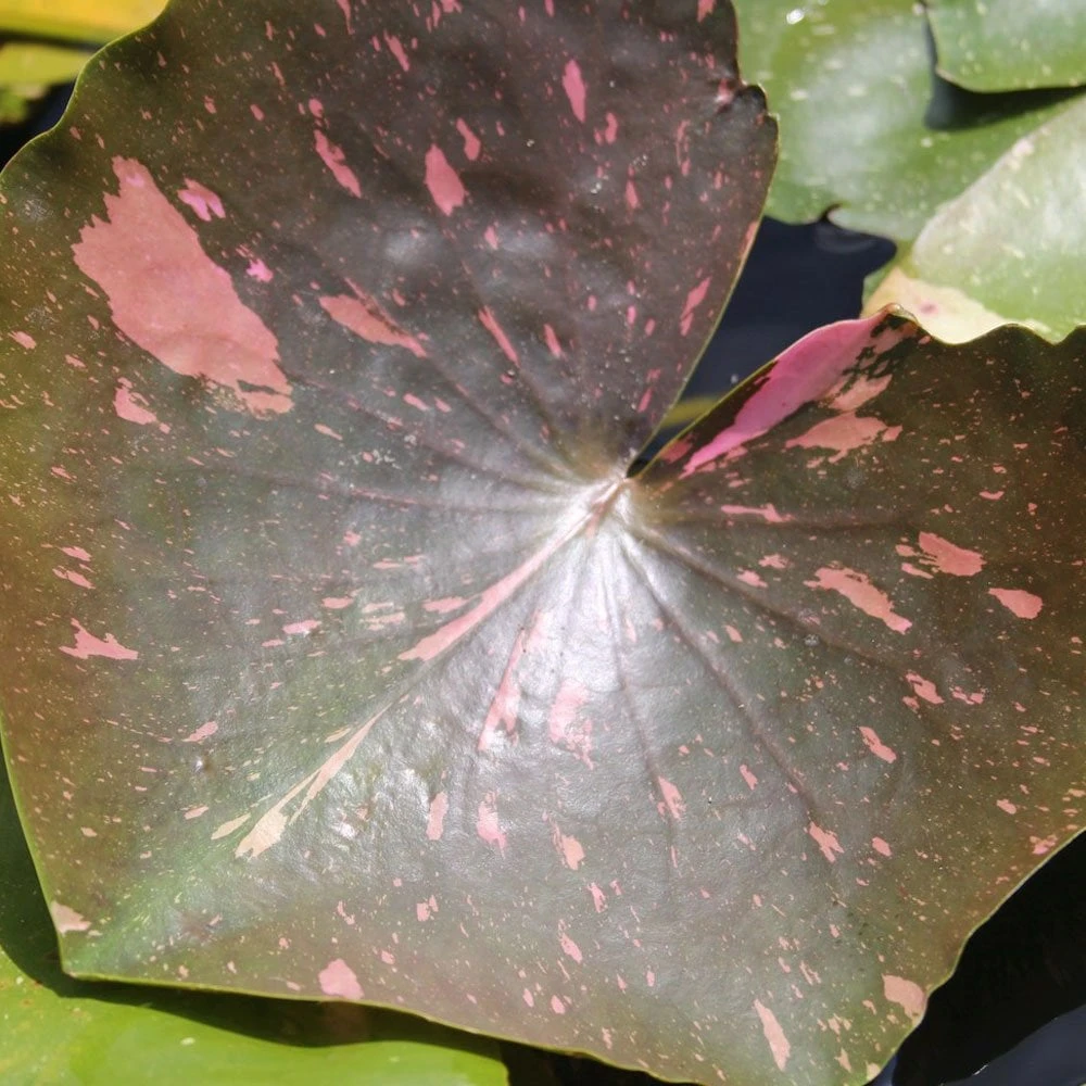 Pretty white, pink blushed starlike shaped flowers. Larger blooms have a pronounced sweet smell. Not as prolifically flowering as other lilies but the unique variegated foliage with red-brown marbled or with yellow & white splashes on the leaves makes up for it. Plant in still water away from splashing fountains. Lower gradually so the leaves can stretch to the surface within a few days. Remove dead leaves and flowers during the growing season.