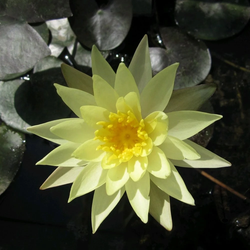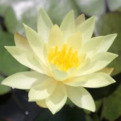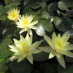 This tuberous-rooted variety has attractive, purple-blotched foliage and large, sulphur-yellow flowers. Plant in still water away from splashing fountains. Lower gradually so the leaves can stretch to the surface within a few days. Remove dead leaves and flowers during the growing season.