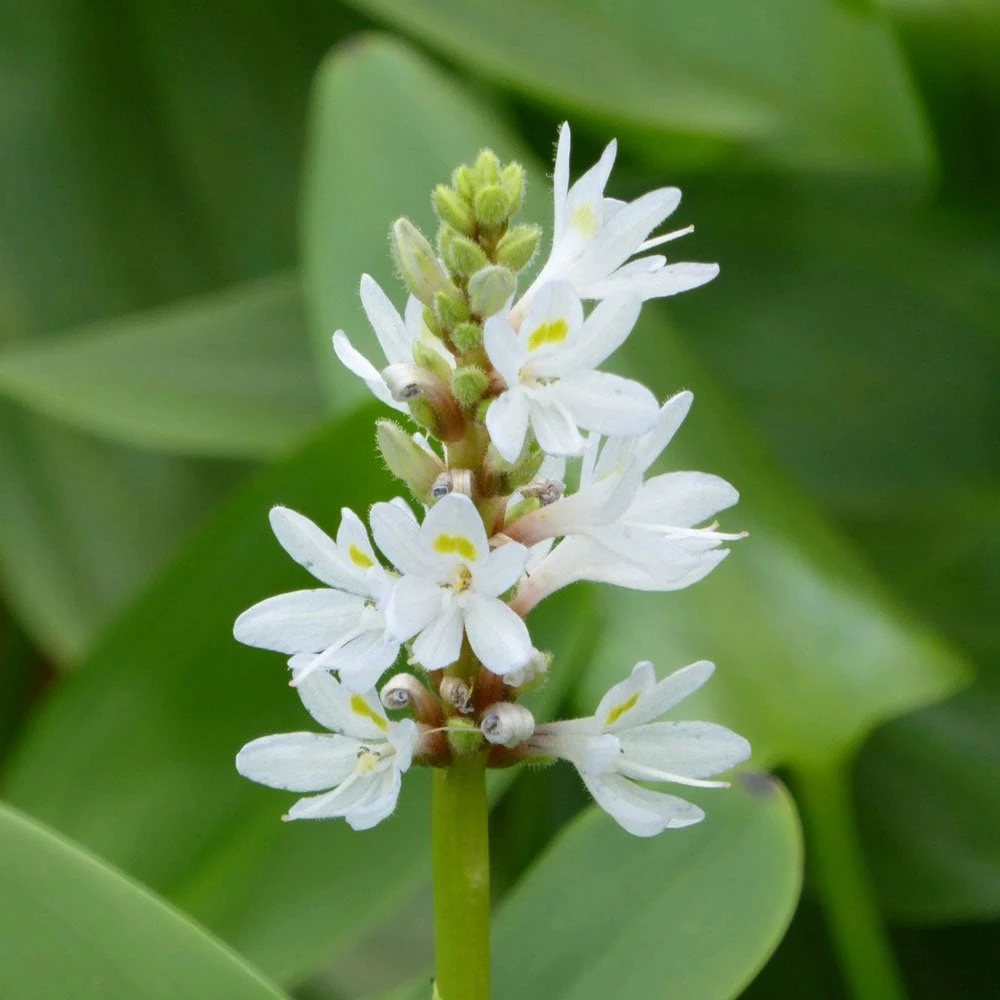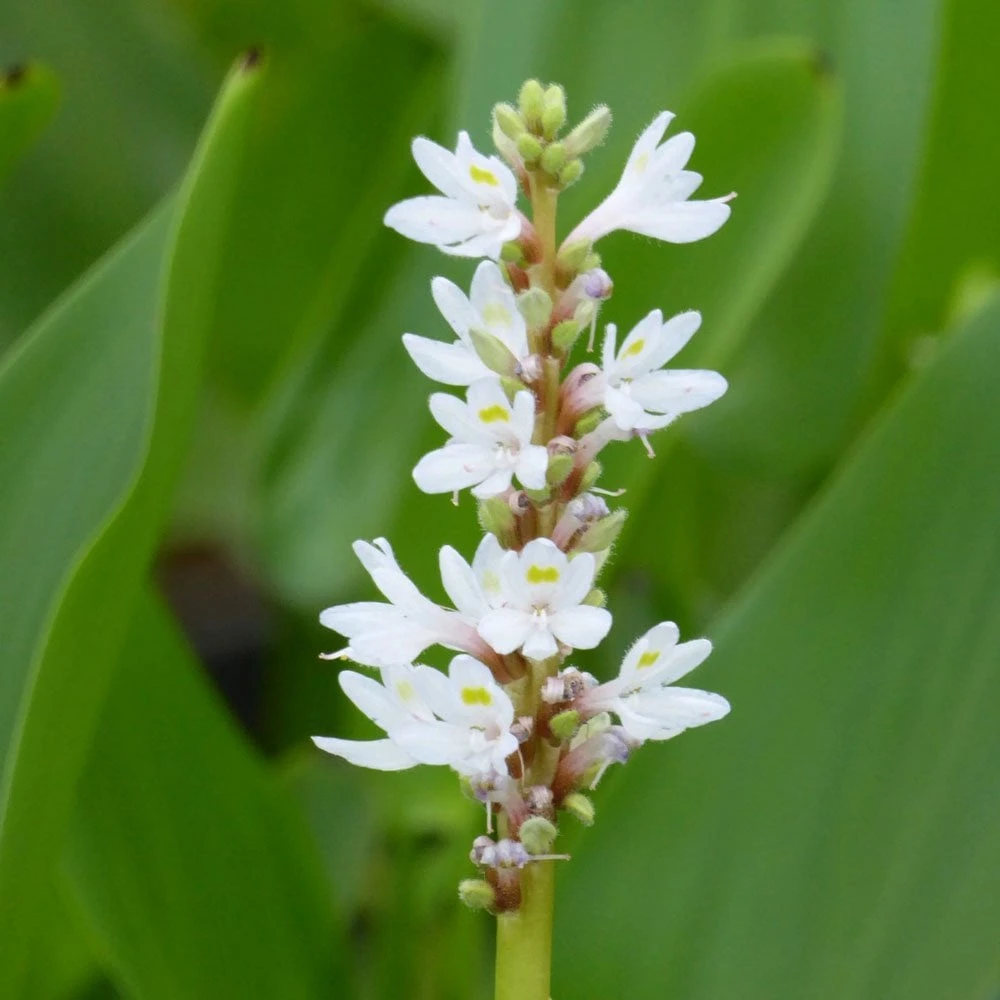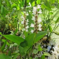 Shorter than Pontederia cordata, it is a late flowering, structural plant with heart shaped green leaves with clusters of white flowers. Little maintenance is required. Trim just above the water surface after foliage has died back in Autumn to tidy.