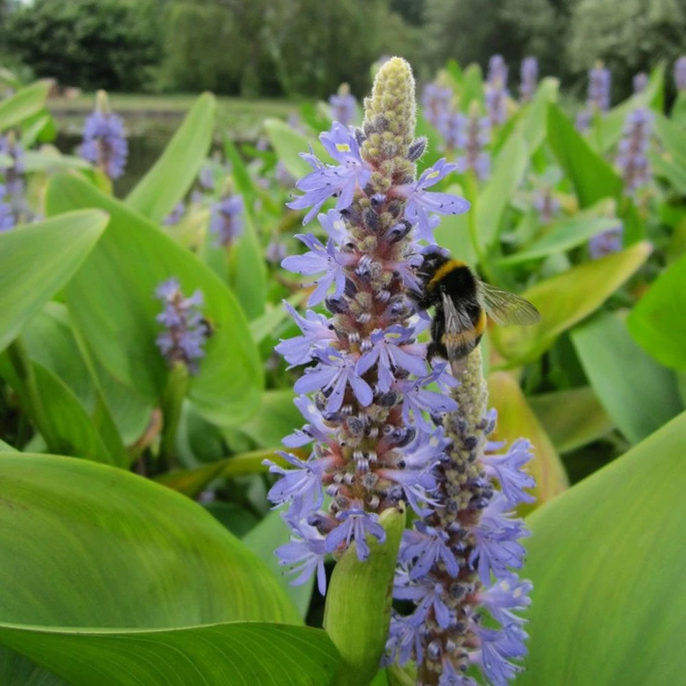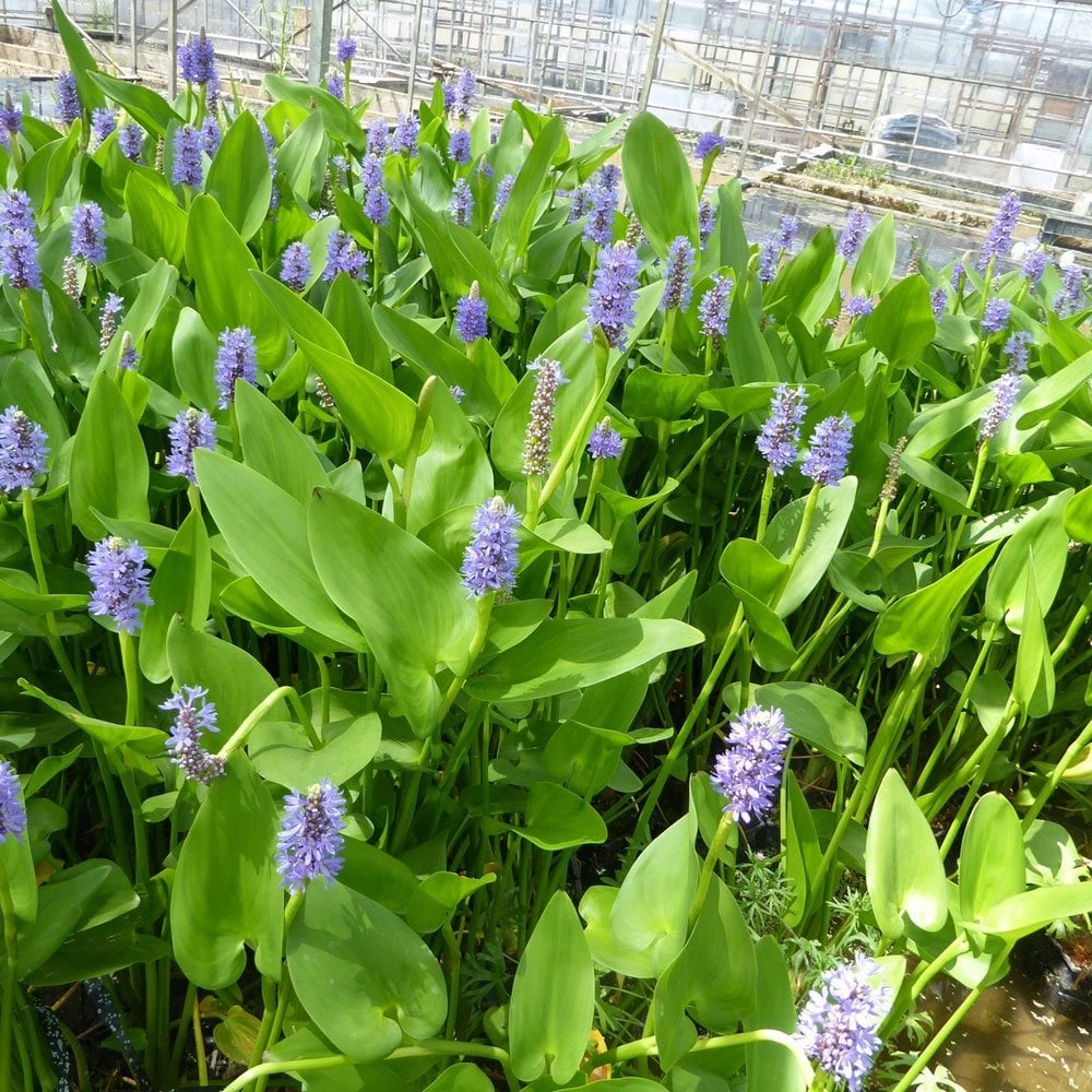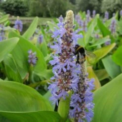 Heart-shaped green leaves with clusters of blue flowers borne on a spike. A tall late flowering structural plant. It is free flowering and slowly grows into a large clump. Little maintenance is required. Trim just above the water surface after foliage has died back in Autumn to tidy.