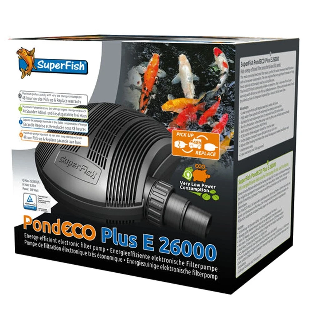 The SuperFish Pond ECO Plus E 26000 Pond Pump provides performance, efficiency and reliability making it an ideal filter pump for koi and fish ponds. Suitable for both submerged and dry mounted installation the SuperFish Pond ECO Plus E Pump range is one of the most economical available. These electronic pumps are perfect for water movement and filtration with an extremely low power consumption thanks to the improved pump motor which offers superb performance, head height and all importantly, low running costs.