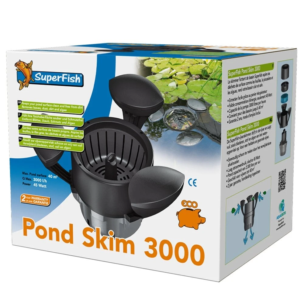The SuperFish Pond Skim 3000 is a floating pond skimmer with integrated pump, suitable for ponds with surfaces up to 40m². The Pond Skimmer floats in the pond and effectively draws in floating debris such as leaves, dust and algae from the waters surface into the waste basket which can then easily be removed.